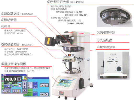 計測用:10X、50X、100X(僅HM-221有),最多可裝四組 | ||||||||||||||